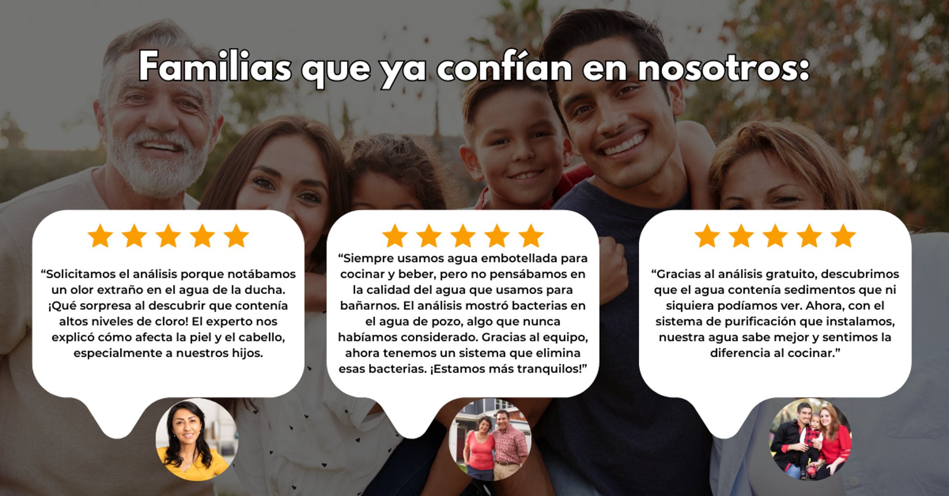 La salud de tu familia y la durabilidad de tus electrodomésticos dependen de la calidad del agua. Nuestros analistas certificados en agua de pozo y de ciudad te ofrecen un análisis GRATUITO para identificar cualquier riesgo oculto. Recibe un informe detallado y las soluciones de filtrado más efectivas para un agua pura, de sabor excepcional y que protege tu inversión. ¡No esperes más, protege lo que más importa! Obtén tu análisis gratuito hoy mismo.